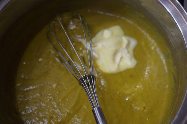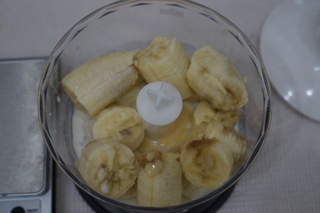 Смешать масло с бананами, растительным маслом и пахтой (кислым молоком).
