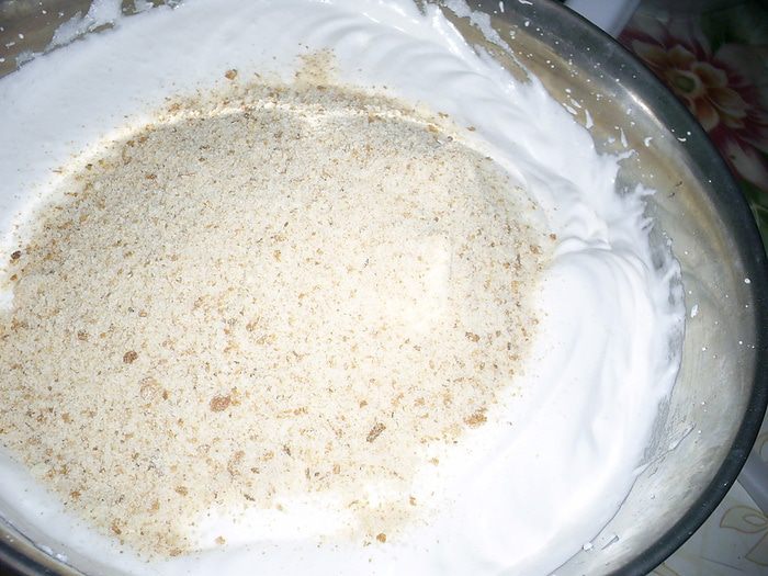 Пришло время добавить сухари. Можно взять белые панировочные, однако под названием "белые", в пачке с магазинными, как правило, могут быть и ржаные (проверенно на своем опыте). Поэтому я смолола на кофемолке 50 граммов сухарей, чтоб быть уверенной в их качестве. аккуратно перемешиваем лопаткой движениями сверху-вниз от краев к центру.