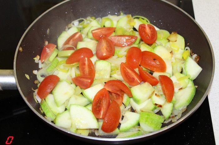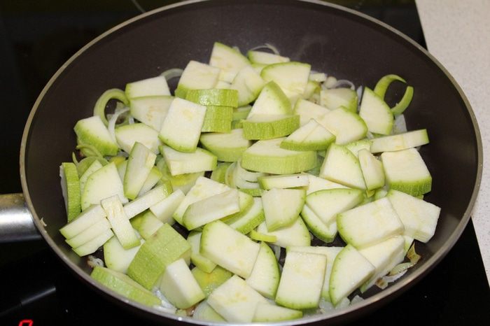 Кабачок порезать четвертинками, добавить к луку, слегка обжарить, затем уменьшить огонь и потомить под крышкой еще 5 минут.