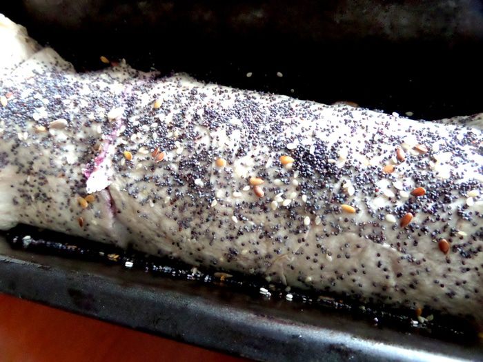 Промазываем верх кисточкой с маслом и присыпаем орешками или маком. Конечно,сливочным маслом смазать-будет вкуснее и красивее,но раз я заявила,что это постный вариант,то буду честна перед Вами до конца)))