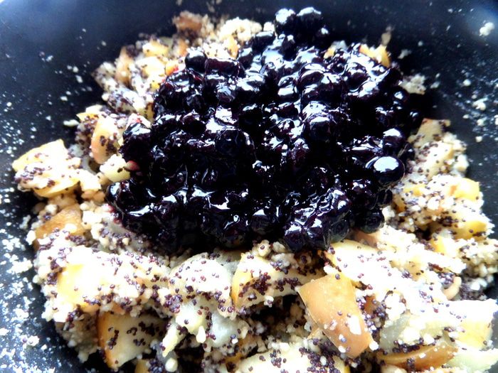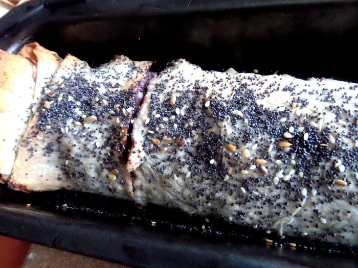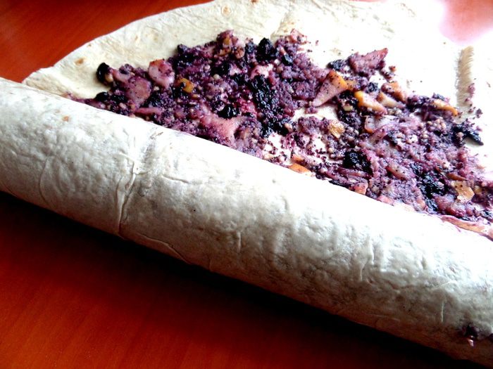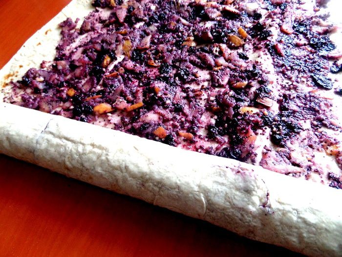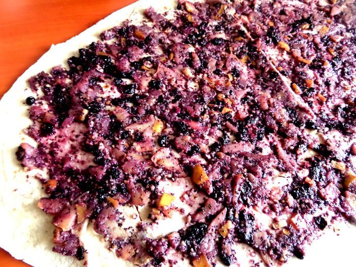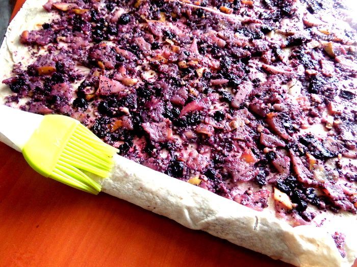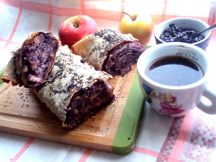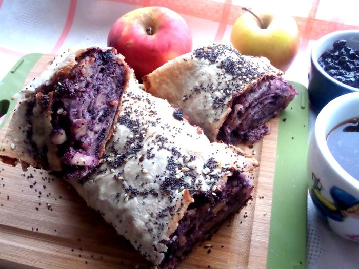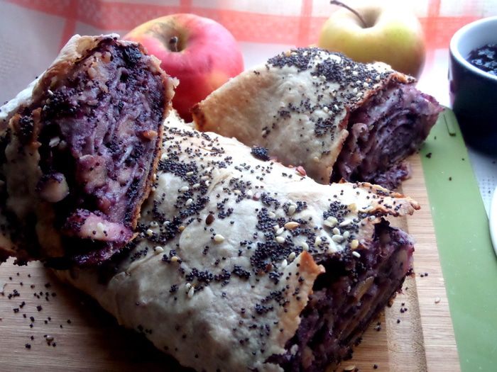 Продолжая череду постных блюд,не обойду стороной и сладкое))) Я уже проверяла,что из тонкого лаваша отлично можно закрутить штрудель! Но я делала его раньше с яблоками и арахисовой пастой,а теперь решила добавить к яблокам и орешкам (это же классика!) мак и для более яркого цвета и вкуса черничное варенье)))