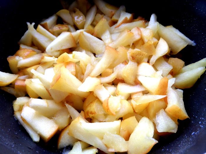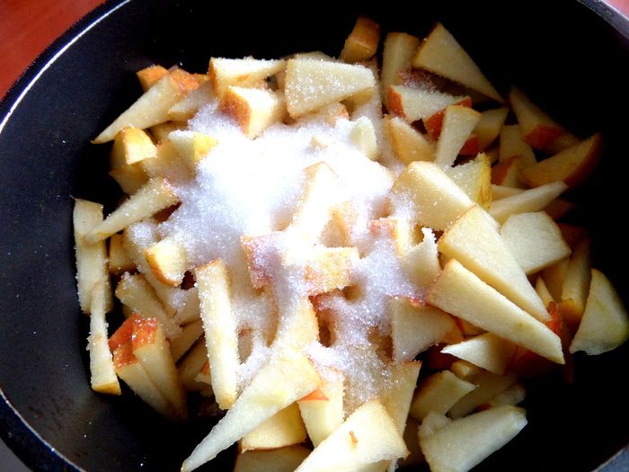 Присыпать яблочки сахаром и поставить на маленький огонь.