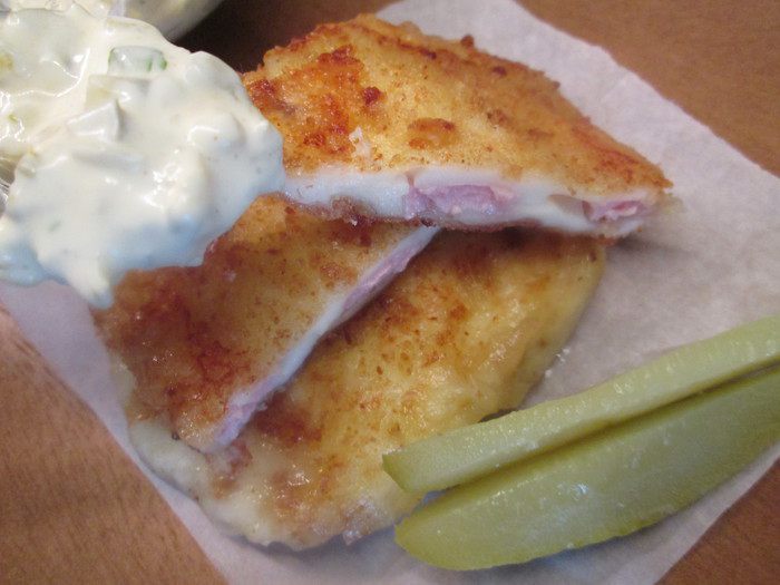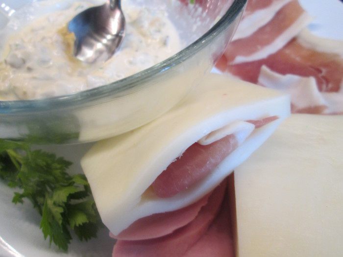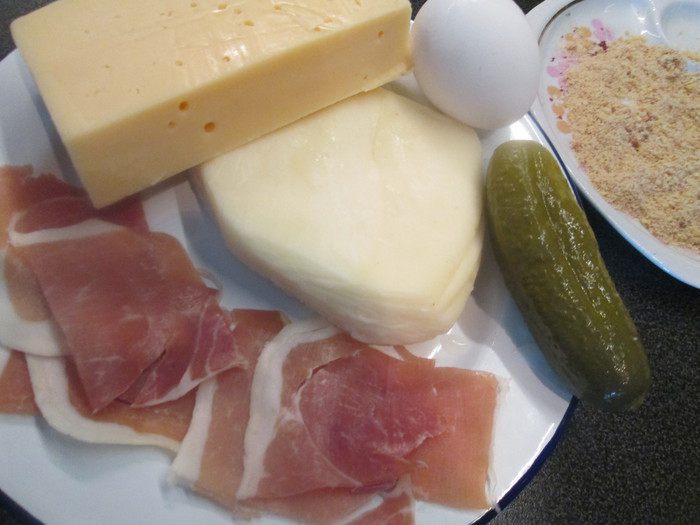 В кусках сыра осторожно сделать «кармашек» — разрез в середине. Вложить в него ветчину. Можно дополнительно вложить кружочки варенного яйца, как было в оригинальном рецепте.