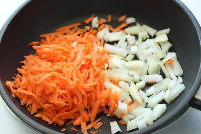 Лук и чеснок мелко нарезать. Морковь натереть на крупной терке.
