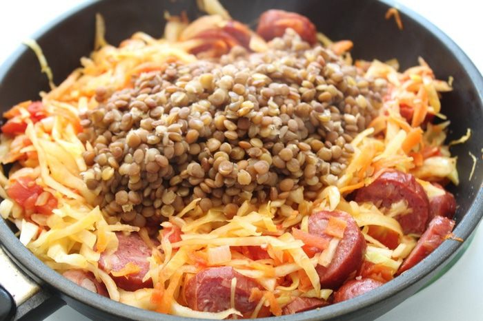 Добавить отваренную чечевицу и потушить еще мин 5.