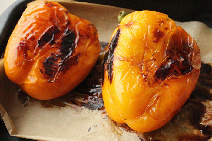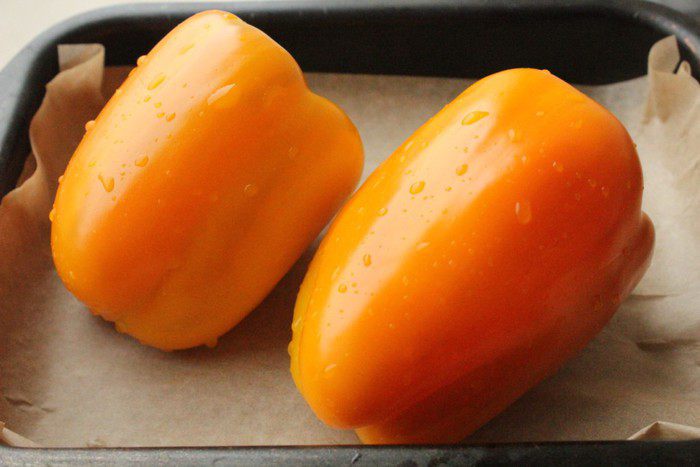 Болгарские перцы (у меня оранжевого цвета) помыть и запечь в духовке на сильном огне.