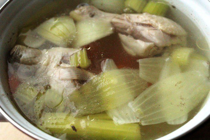Сварить куриный бульон с добавлением моркови, репчатого лука и сельдерея. Процедить.