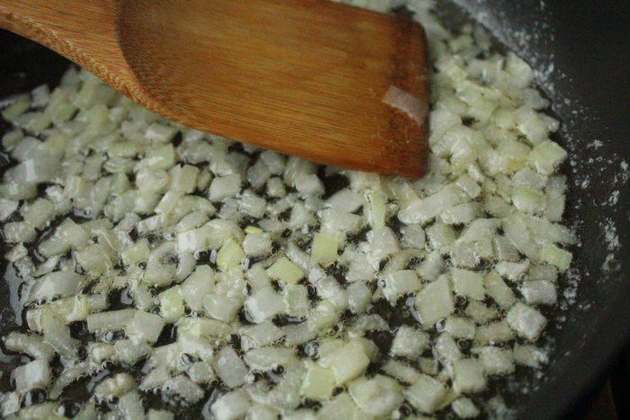 Добавить к луку рис и, постоянно помешивая, дать рису стать полупрозрачным.