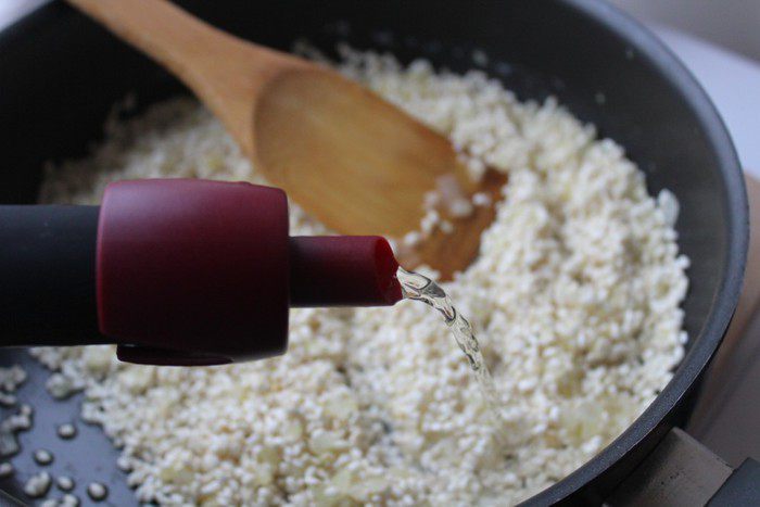 После того, как вино полностью впитается в рис, небольшими порциями влить куриный бульон. Рис нужно непрерывно перемешивать лопаткой.