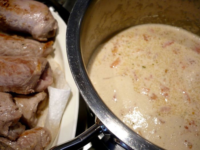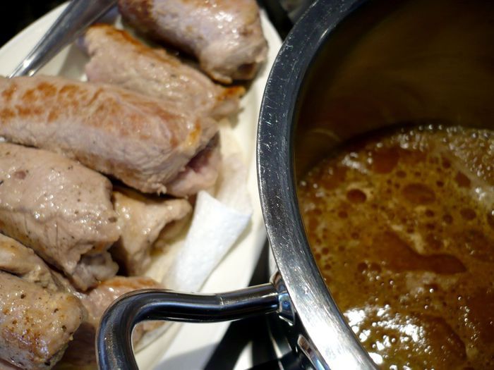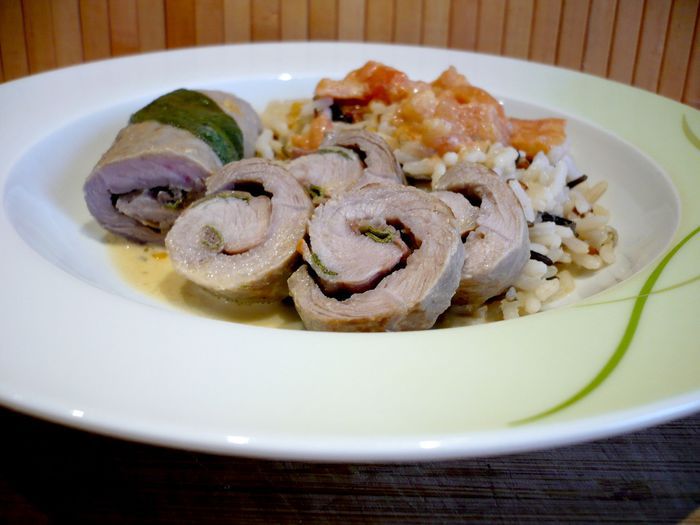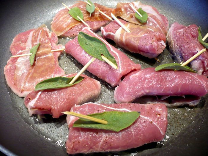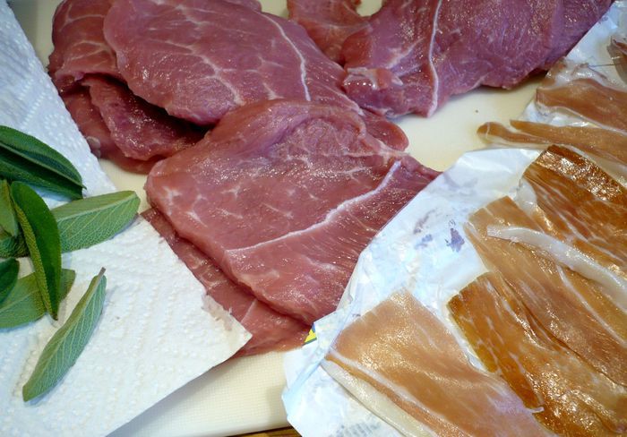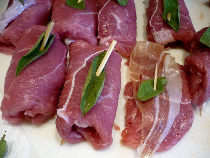 Вот так выглядит более распространенный вариант салтимбокка. На кусочек мяса выкладываем сначала ломтик пармской ветчины, затем два листика шалфея и закрепляем их зубочистками. Так как я очень люблю жареный шалфей, то просто не сумела спрятать весь шалфей внутрь рулетика, а положила лишь один листик внутрь, а другой прикрепила сверху так, чтобы и сам рулетик не разворачивался.