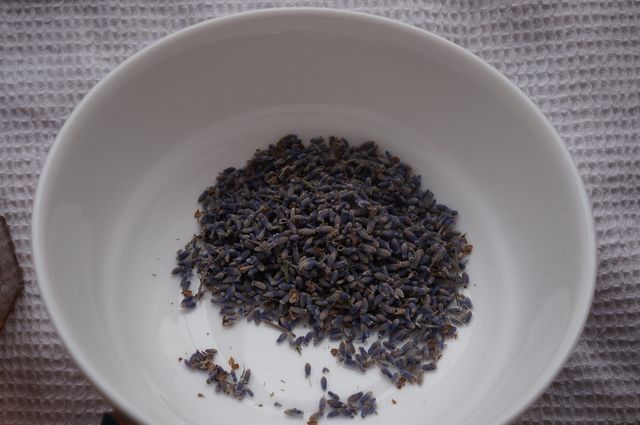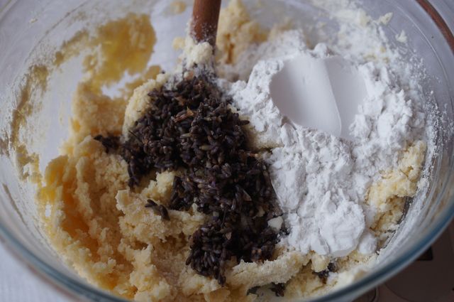 Сливаем воду с лаванды, отжимаем и смешиваем с тестом.