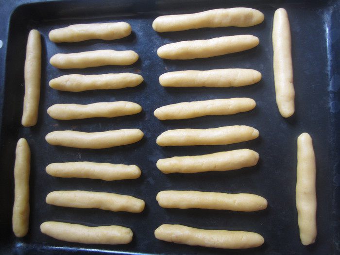 Из теста скатать палочки. Смазать их белком с помощью кисточки (этим советом я пренебрегла, наверное, поэтому посыпка держалась не очень крепко и после выпекания большая часть кунжута обсыпалась=(....)