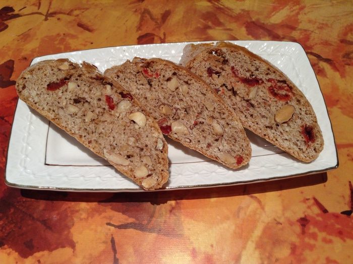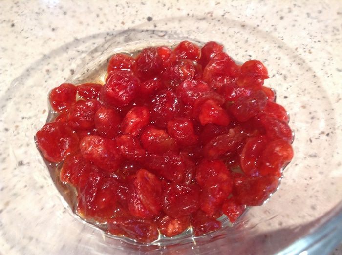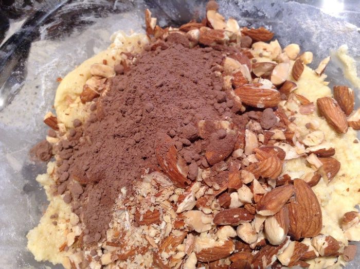 Добавить миндаль (измельчить на крупные куски), какао и вишню (коньяк слить).
