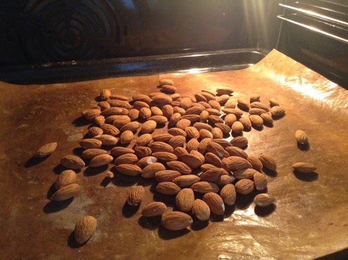 Миндаль обжарить в духовке 10 минут при 160 градусах.