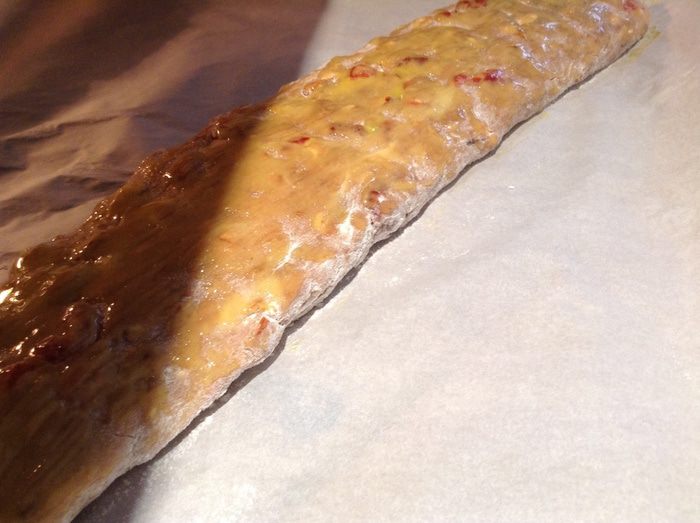 Сформировать "колбаску", обмазать яйцом и отправить в духовку на 35 минут при 180.