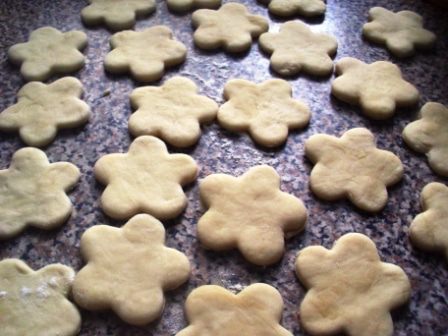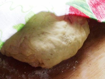 Поднявшееся тесто обмять, припылить мукой, раскатать пласт толщиной 0,5 см. Теперь самое интересное! Вырезаем формочкой заготовки (можно воспользоваться простой рюмкой), накрыть их полотенцем и оставить ненадолго для подъема.