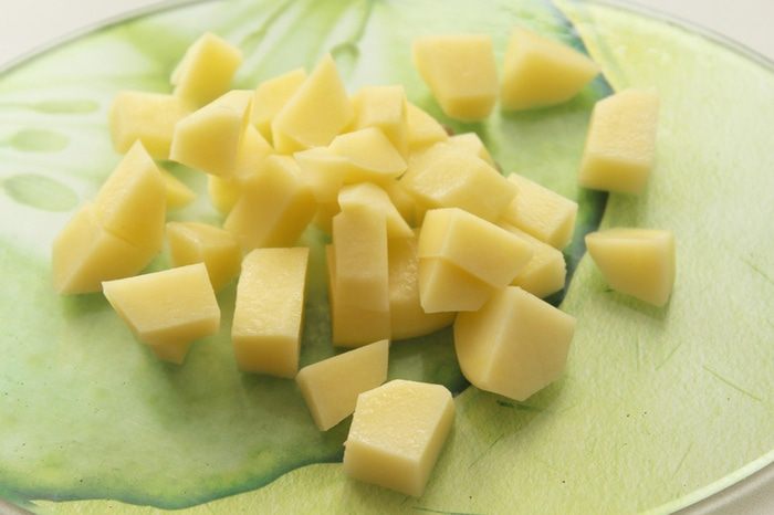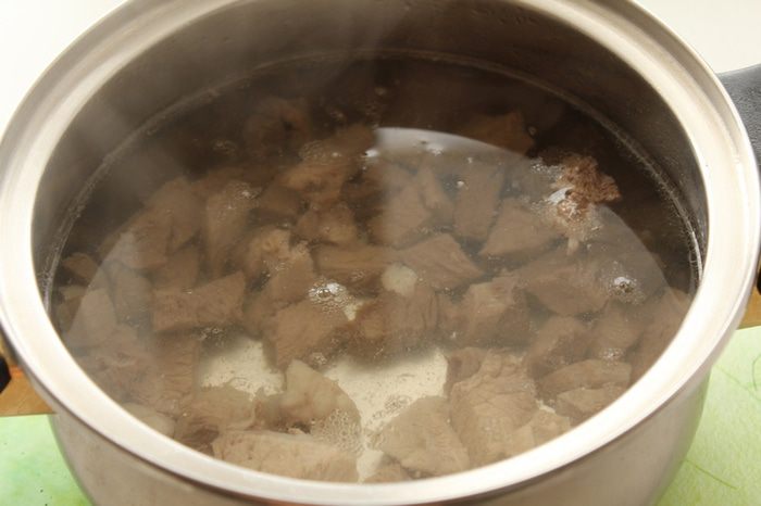 Отварить мясо, достать и порезать на небольшие кусочки.