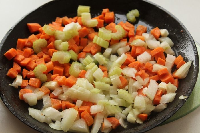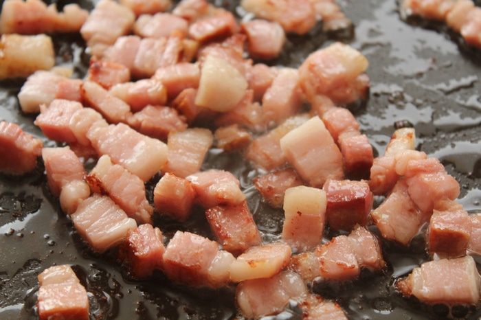Грудинку или бекон порезать небольшими кусочками и обжарить. Убрать в сторонку.
