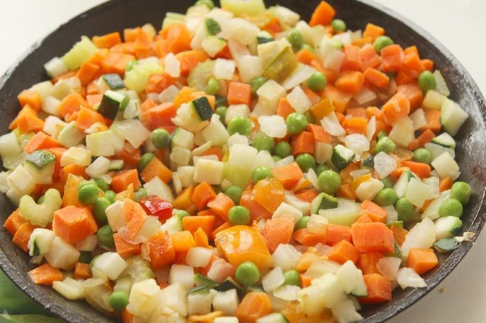 Добавить овощную смесь (горох, цукини, морковь), обжарить на растительном масле.