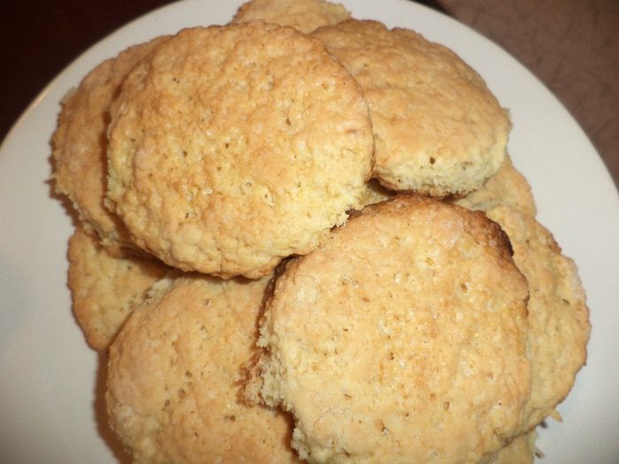 Тесто раскатать в пласт толщиной 0,5 см. Стаканом вырезать из теста кружочки. Выложить кружочки на смазанный маслом противень. Сверху кружочки слегка придавить вилкой.