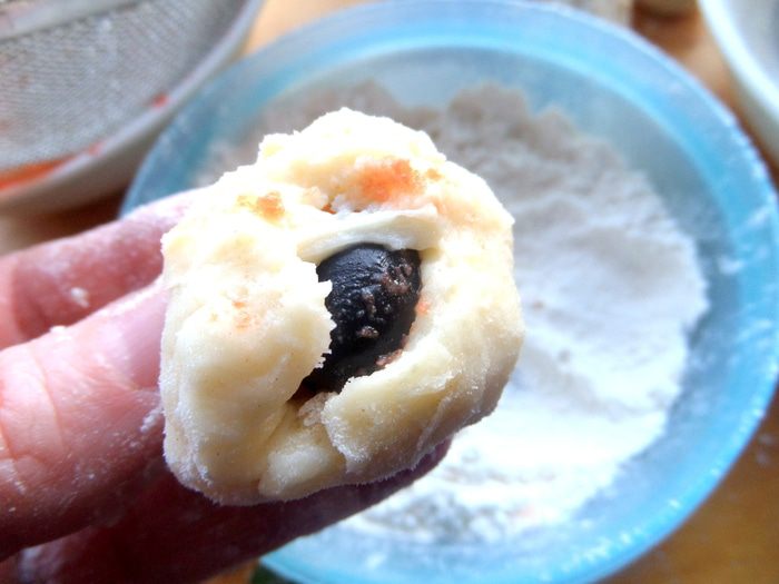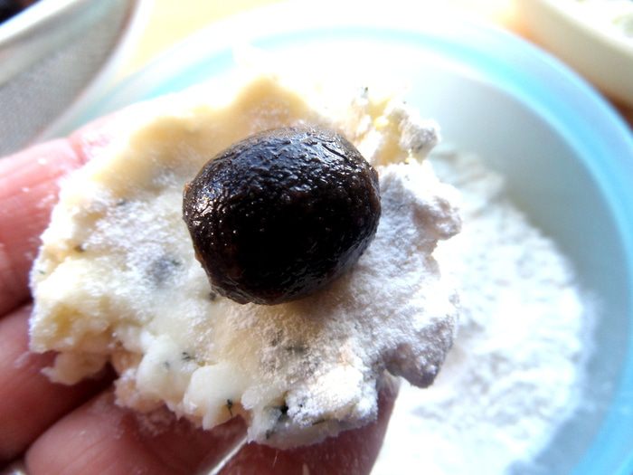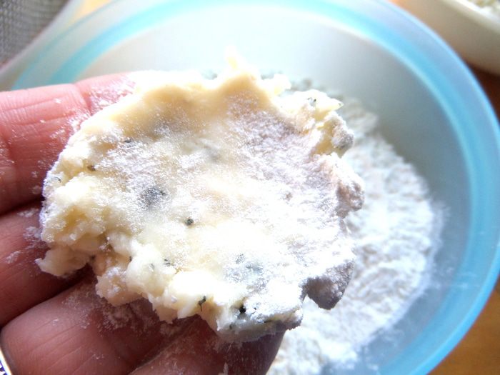 Из сыра делаем лепёшечку на ладони (пришлось обмакнуть пальцы в муку).