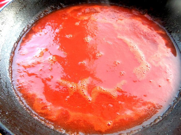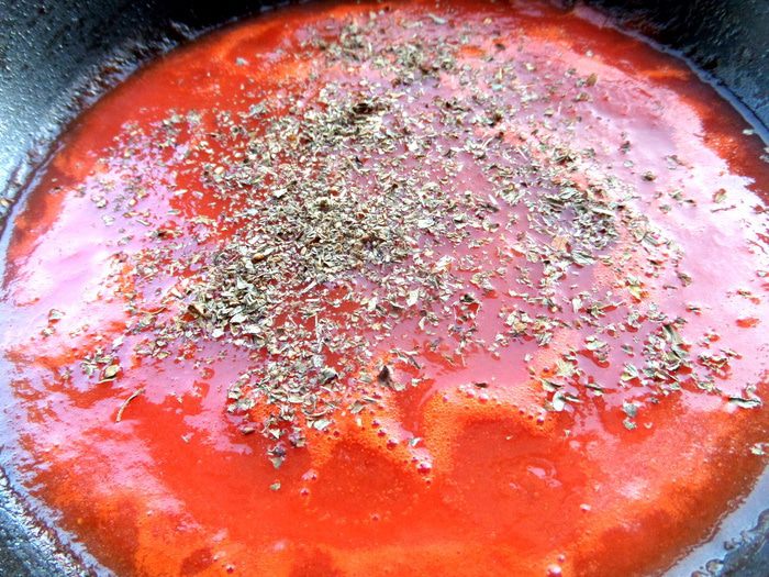 Для соуса протёртые томаты выливаем в высокую сковороду.