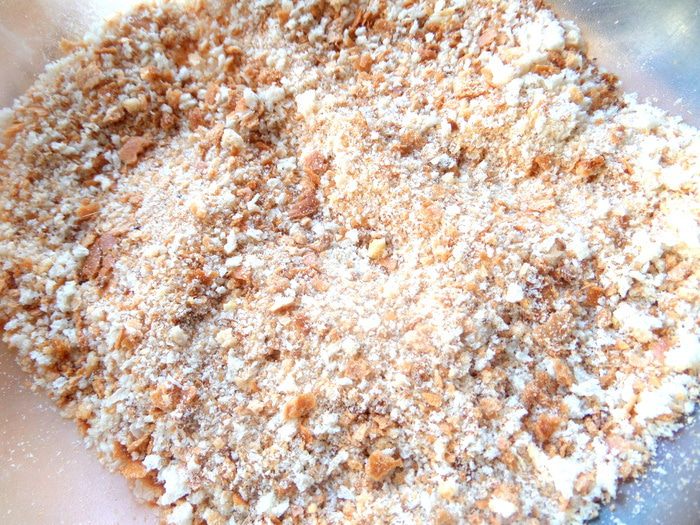 Сухари делаем из высохшего батона с помощью толкушки.
