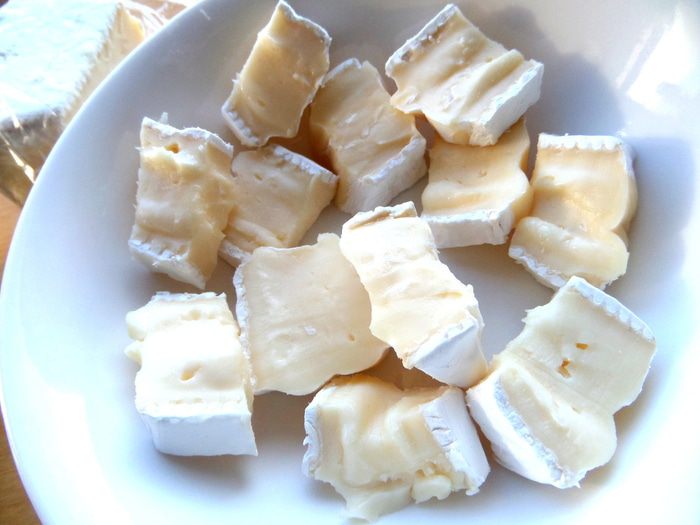 Готовим основу для шариков. Вместо феты я взяла сыр BRIE...,нарезала его на кусочки.