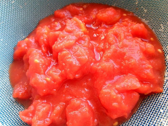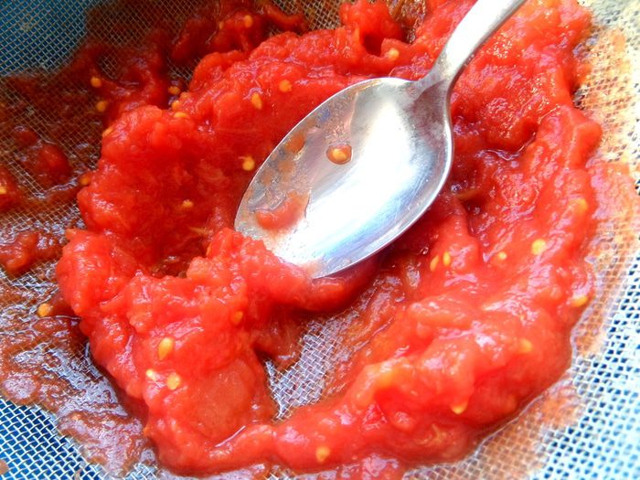 Вначале нужно протереть банку томатов (у меня кусочками) через сито.