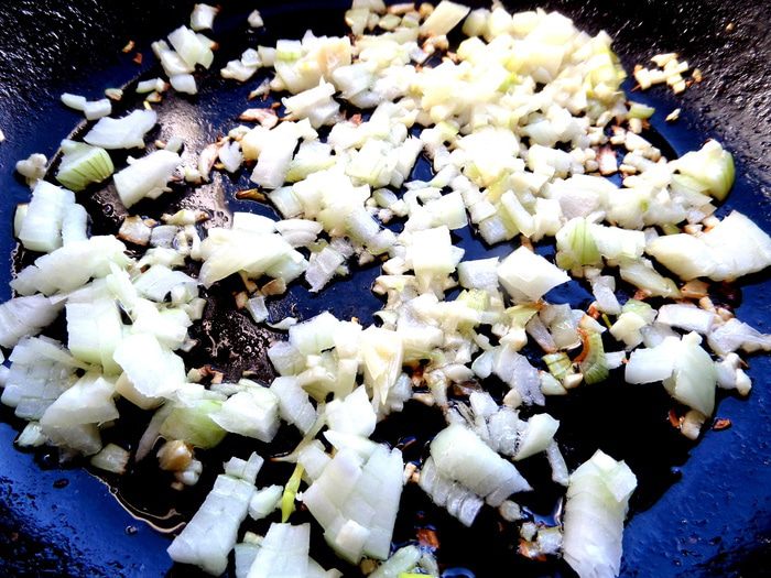 Лук, чеснок измельчить и обжарить в растительном масле.