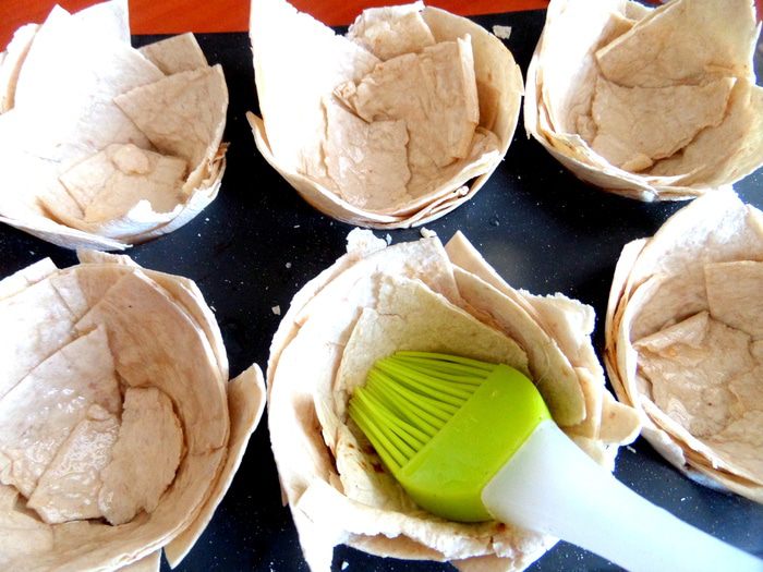 Смазываем корзиночки обильно растительным маслом,а ещё лучше -каждый слой, будут по вкусу совсем как слоеные!