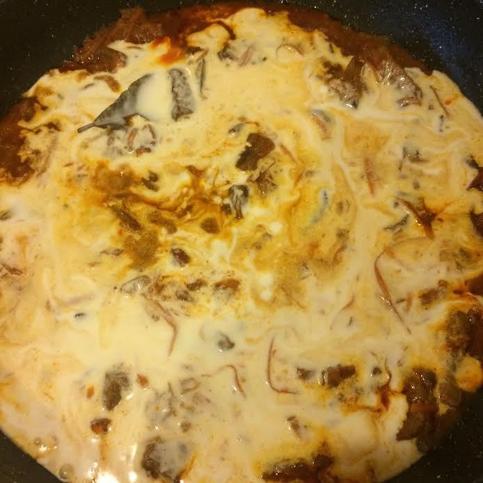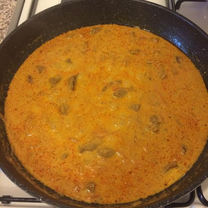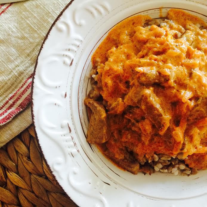 Сметану смешать с 1/2 стаканом воды, добавить к мясу, перемешать и тушить еще 10-15 минут.