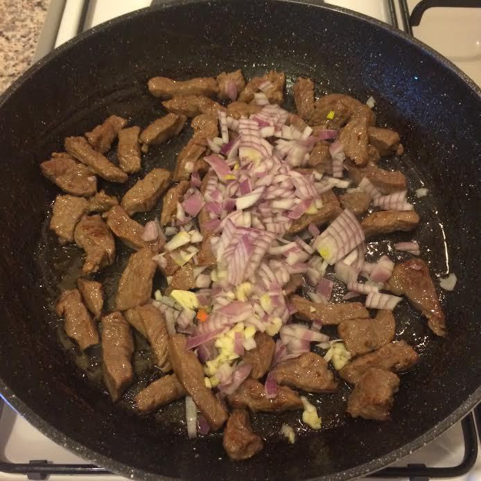 Разогреть сковороду с толстым дном, обжарить мясо, добавить лук, чеснок, перемешать и тушить 2-3 минуты.