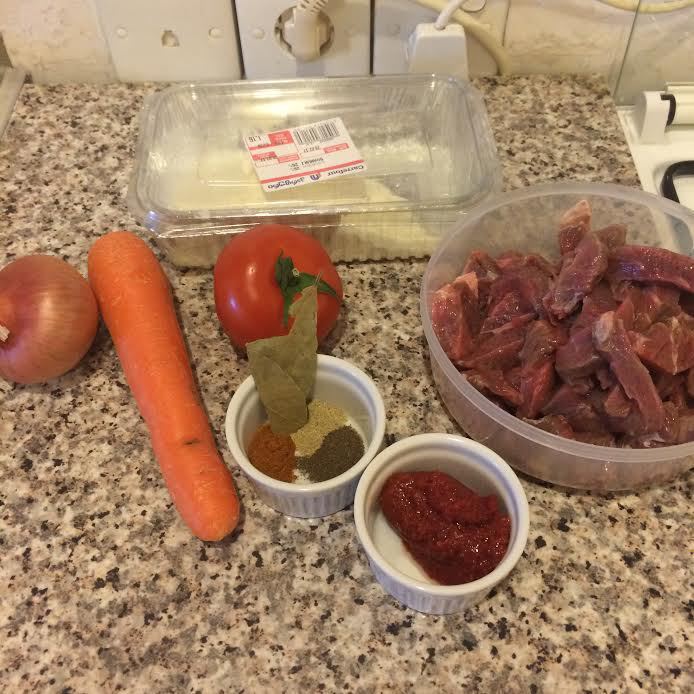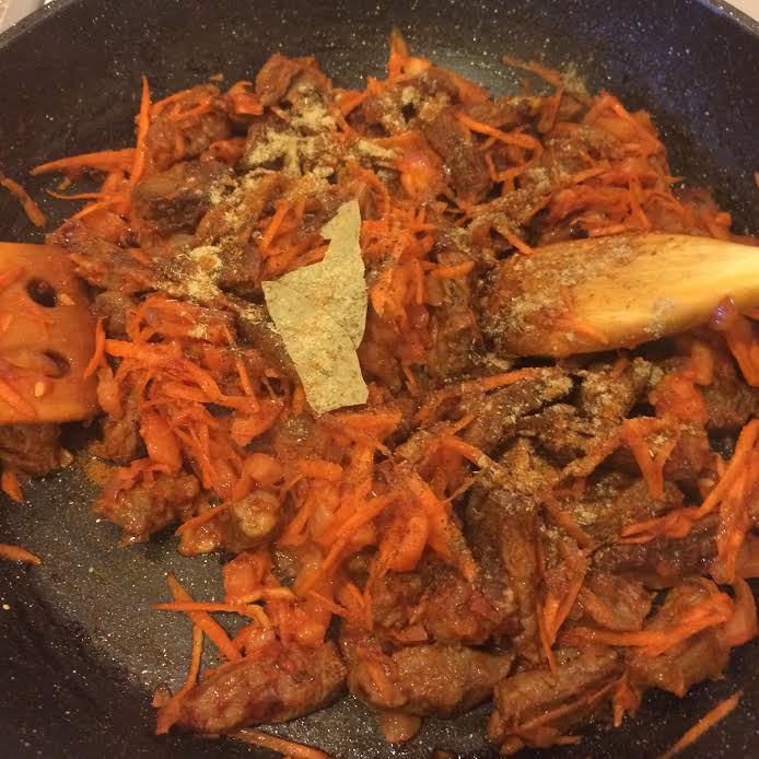 Морковь натереть на крупной терке, помидор очистить и нарезать. К мясу добавить томатную пасту, перемешать. Затем добавить морковь, помидор, специи, лавровый лист, 1/2 стакана воды, накрыть крышкой и тушить до готовности мяса.