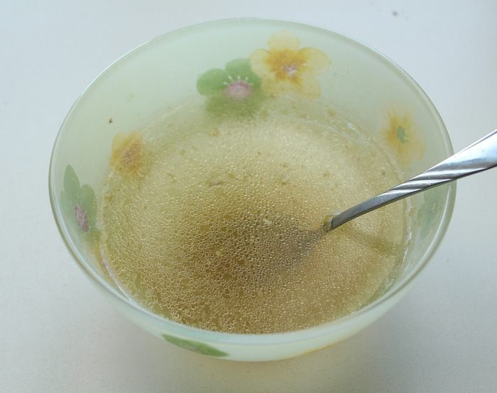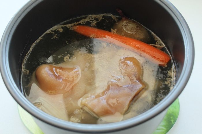 Быстрорастворимый желатин залить горячим бульоном (правда больше половины не пригодилось). Если у вас обычный желатин, действуйте согласно инструкции.
