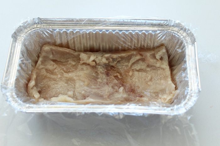 Выложить остальное мясо в форму, ещё раз слегка уплотнить, залить желатиновым бульоном. Прикрыть форму концами пленки. Убрать в холодильник на ночь, придавив сверху небольшим грузом.