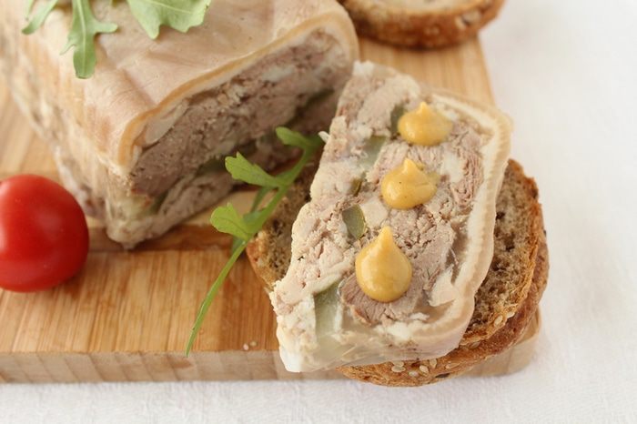 На кожу в форму уложить половину подготовленного мяса. Утрамбовать. Залить мясо несколькими ложками желатинового бульона.