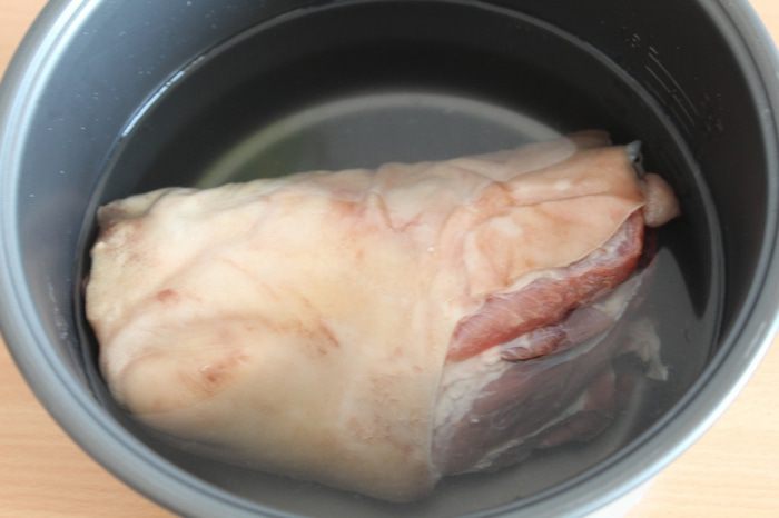 Уложить рульку в мультиварку, (или кастрюлю) залить холодной водой чтобы она только слегка её прикрывала, добавить морковку, луковицу, стебли сельдерея. Варить рульку около 3-х часов. За час до окончания варки добавить соль по вкусу.
