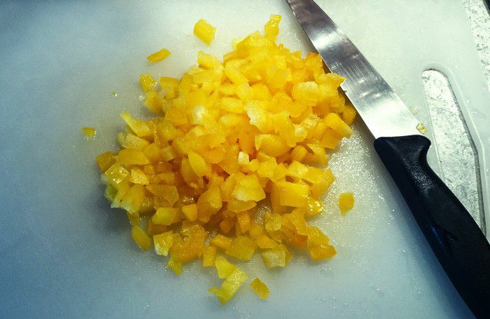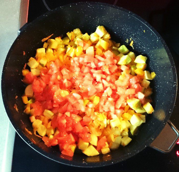 Добавить помидоры и болгарский перец, тушить 10 минут.