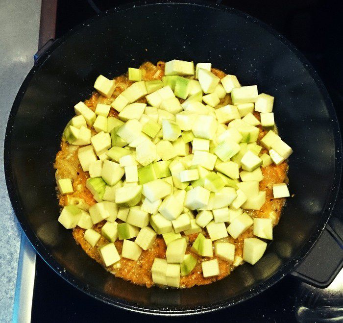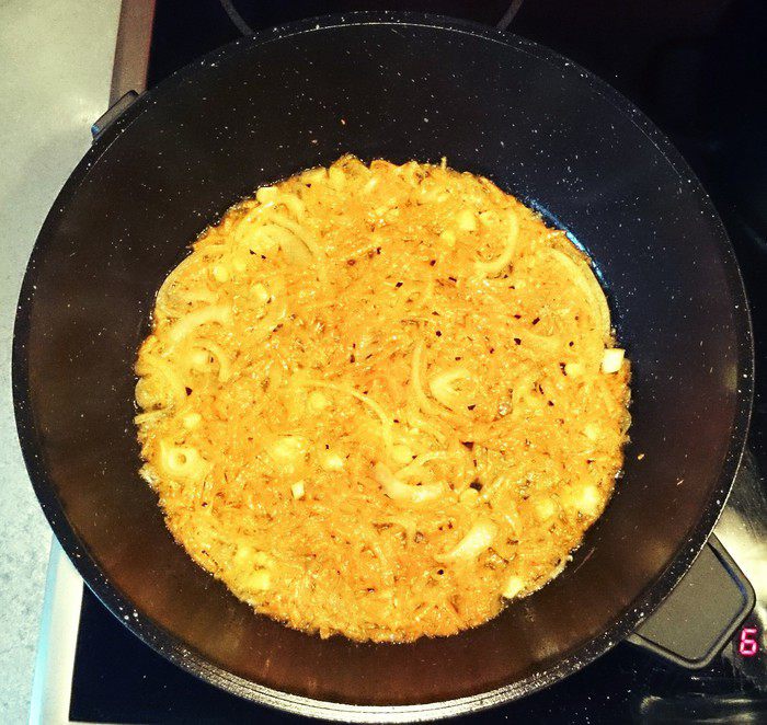 В сковородке на оливковом масле, пассеруем лук и морковь.