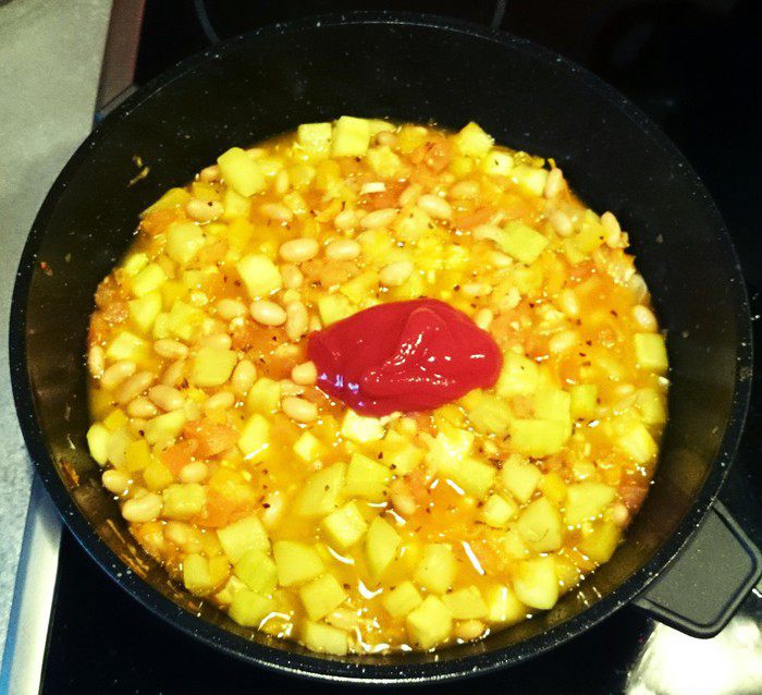 Добавить фасоль, томатную пасту, измельченный чеснок, базилик, соль и перец. Довести до кипения и выключить.