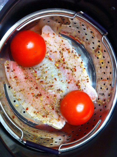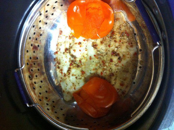 Промытую и размороженную рыбку (у меня филе) натираем специями и солью, оставляем на 15-20 минут (немного по-мариноваться). Затем выкладываем в паровую корзинку, добавляем овощи ( в этот раз у меня помидоры, в предыдущие разы добавляла дольки кабачка и брюссельскую капусту).