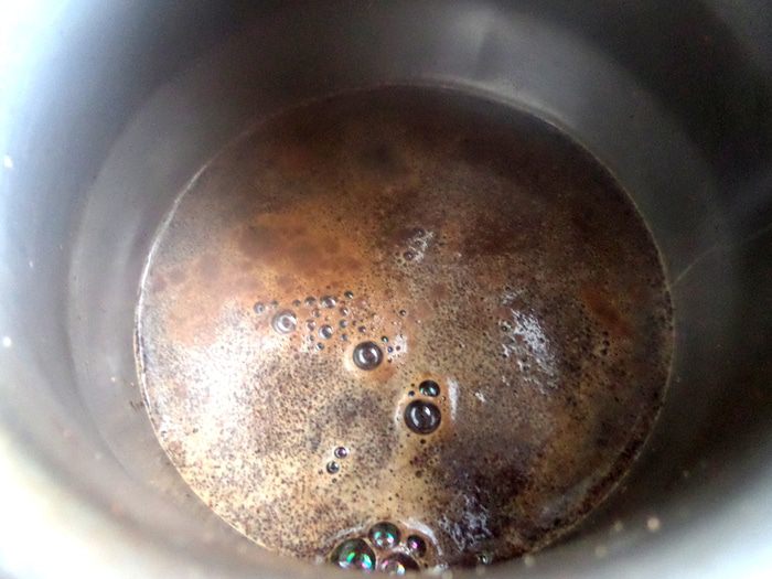 Поставить на тот же маленький огонь и ждать появления пузырьков. Турку можно поднимать и опускать с огня,не допуская закипания напитка!