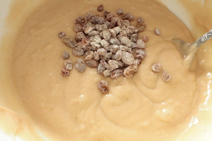 Муку смешать с разрыхлителем, просеять и добавить к жидкости, перемешать, добавить изюм, предварительно посыпанный мукой, перемешать.