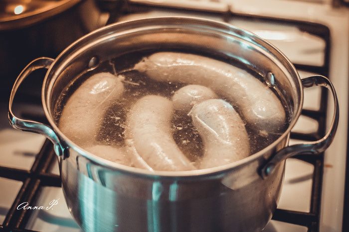 Перед тем как колбаски отправить в духовку, их надо на 10 минут опустить в кипяток (85-90 градусов по С ) и перевернуть один раз.