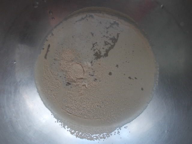 Подогреть воду и высыпать чайную ложку дрожжей с горкой. Оставить на 10-15 минут.