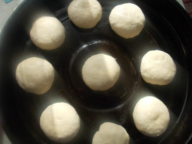 Тесто разделить на 9-10 булочек. Хорошо каждую замесить,как-бы заворачивая тесто во внутрь, выложить на смазанный маслом противень.