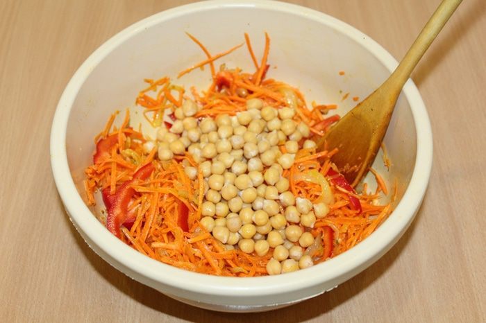 Добавить отваренный нут, посолить, поперчить по вкусу, если это необходимо.