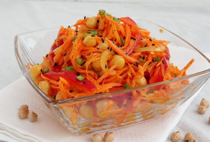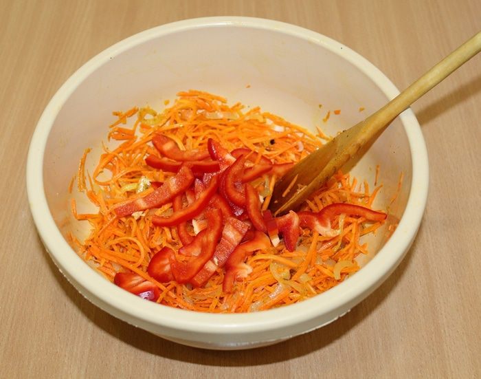 По вашему любимому рецепту приготовить морковь по-корейски, болгарский перец порезать соломкой, добавить к моркови.