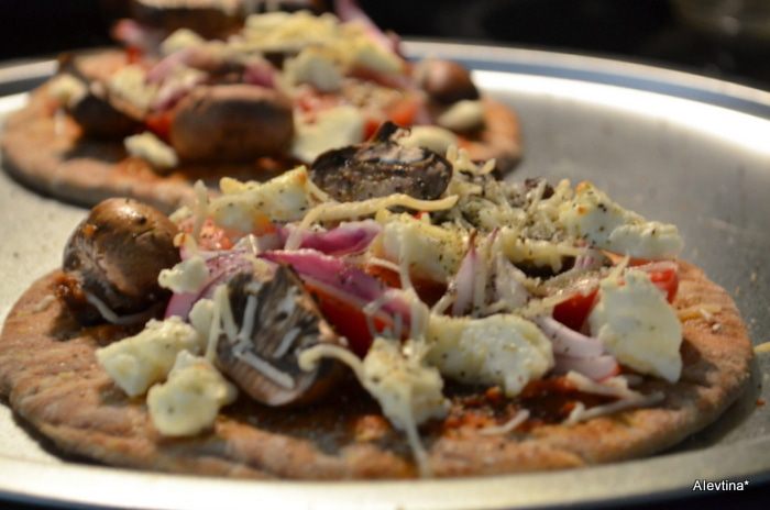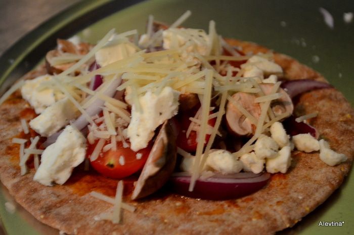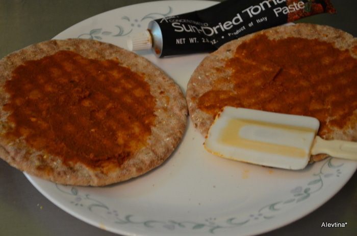 Лепешки смазать пастой из вяленых помидор. Если нет такой пасты в продаже, просто берите томатную пасту, приправить по вкусу. Шампиньоны слегка обжарить.